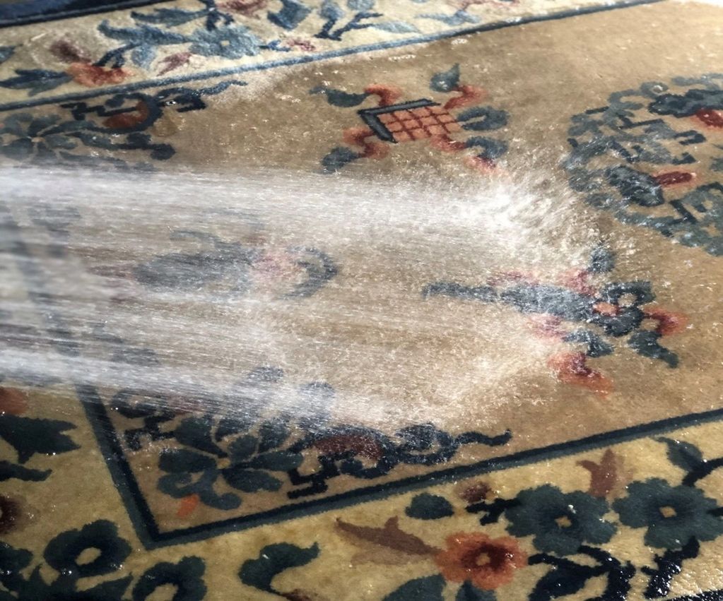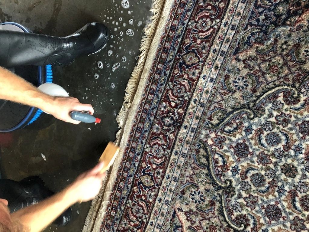 We soak the rug with cold water, and then apply our special non-toxic, wool safe rug shampoo (for wool rugs) and hand wash your rug, gently scrubbing with our soft brush. We do use rotary scrubbing machine with soft bristle brush, depending on the type of the rug, which is determined during the inspection.